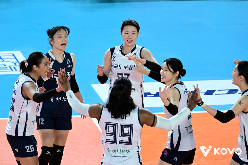 한국도로공사는 7일 대전 충무체육관에서 열린 진에어 2025~26 V리그 여자부 정관장과의 3라운드 원정 경기에서 세트 스코어 3-2(25-23, 25-23, 17-25, 19-25, 15-12)로 승리했다. '주포' 모마 바소코가 32점, 타나차 쑥솟과 강소휘가 각각 15점과 12점을 지원했다.