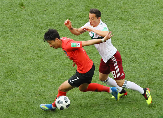 2018 러시아 월드컵 조별리그 3차전에서 독일을 상대로 경기하는 손흥민. 사진=연합뉴스 러시아 월드컵 직후인 2018년 7월 토트넘 소속의 손흥민이 친선 대회를 위해 미국에 갔을 때 멕시코 팬들이 '러시아 월드컵 독일전 득점자'인 손흥민에게 감사 인사를 하고 있다. 사진=토트넘 SNS 한편 한국은 개최국 멕시코와 한조에서 만난 게 껄끄럽기도 하지만, A조에서 기대 이상의 선전을 한다면 이후 토너먼트에서 이점을 챙길 수 있는 대진이다. 한국이 A조 1위에 오른다면, C·E·F·I·J조 3위 중 한 팀과 만난다. 후보는 스코틀랜드(C조), 코트디부아르(E조), 세네갈(I조), 알제리(J조) 등이 꼽힌다. 이럴 경우 32강전은 멕시코시티에서 치르기 때문에 이동 거리도 짧아진다.