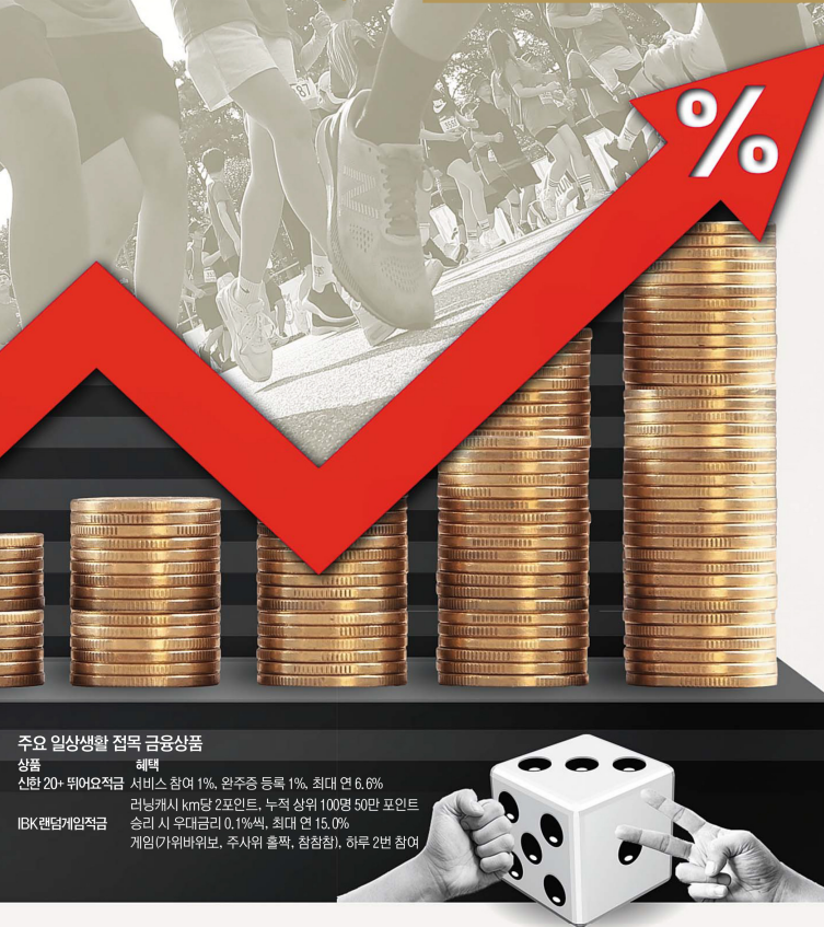 러닝과 게임 등으로 금리를 끌어올리는 참여형 금융 혜택이 인기다. 시중은행들은 트렌드와 연령대의 특성을 반영한 콘텐츠를 금융상품과 연결시키며 기존의 틀을 깨고 있다. 일상생활을 즐기면서 10%대의 고금리 혜택까지 챙길 수 있는 방법을 알아봤다.