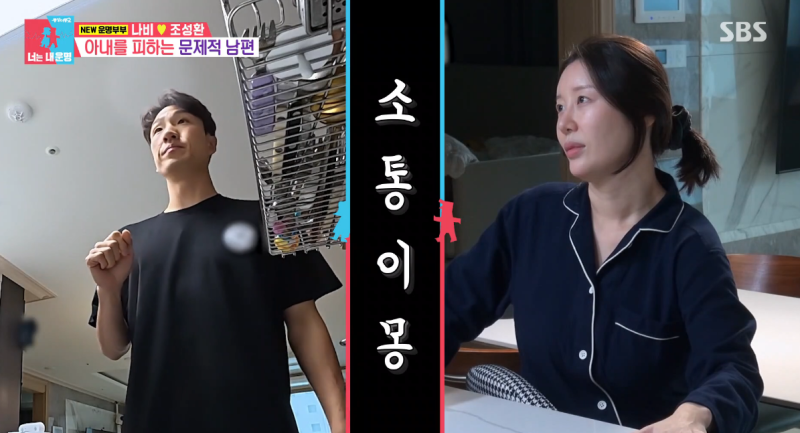 사진=SBS 캡처 실제로 부부의 일상 풍경 속 남편 조성환은 육아에 소홀한 모습이었다. 나비의 어제 몇시에 들어왔냐는 질문에 남편은 “9~10시”라고 말했고, 나비의 아들 식사를 챙겨달란 부탁에 바쁘다며 휴대폰을 들고 방으로 들어갔다. 김숙도 “나비를 피하는 것 같다”고 말했다.