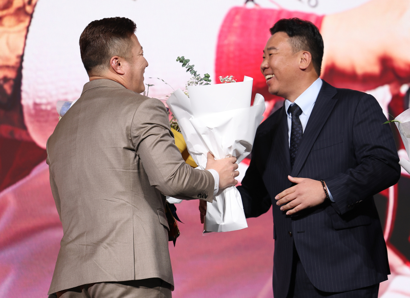 9일 서울 송파구 롯데호텔 월드에서 열린 프로야구 2025 신한 SOL뱅크 골든글러브 시상식에서 지명타자 부문을 수상한 최형우가 이범호 감독에게 꽃다발을 받고 있다. 2025.12.9 [연합뉴스]