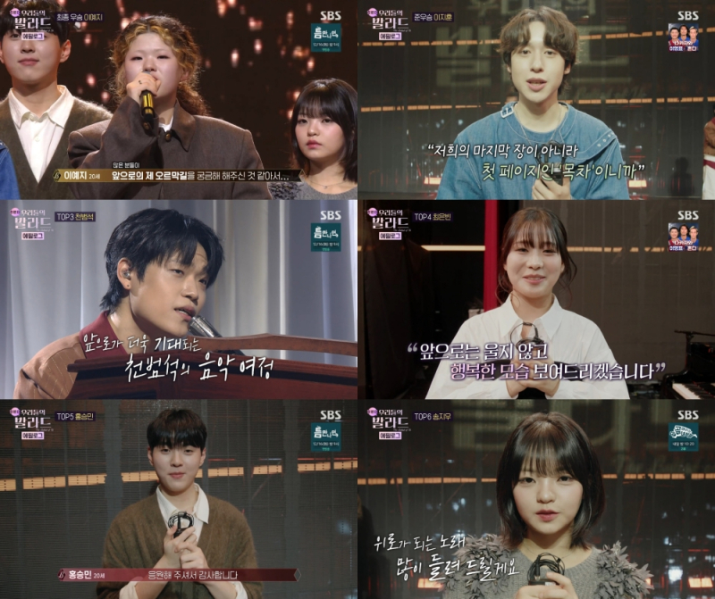 한편, 최종 우승자 이예지를 비롯한 톱6 송지우, 이지훈, 천범석, 최은빈, 홍승민, 세미파이널 진출자 김윤이, 민수현, 이준석, 임지성, 제레미, 정지웅 12인은 오는 2026년 ‘우리들의 발라드 전국투어 콘서트’를 통해 전국 각지를 순회하며 팬들과 만난다.