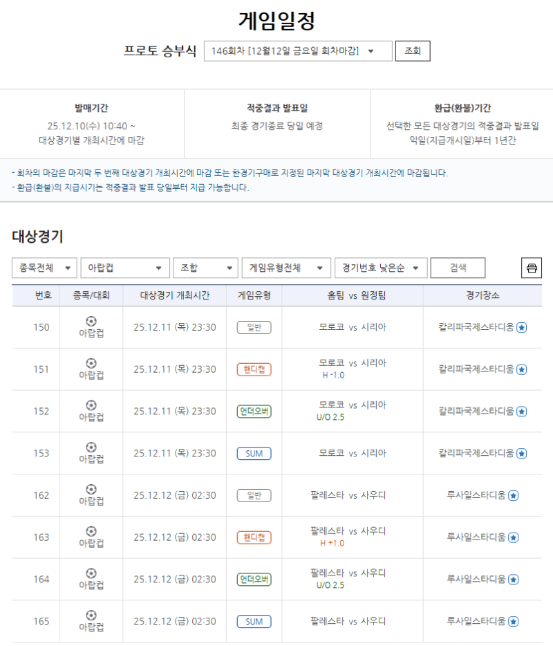 서울올림픽기념국민체육진흥공단(이사장 하형주)이 발행하는 체육진흥투표권 스포츠토토의 수탁사업자 한국스포츠레저㈜가 FIFA 아랍컵 카타르 2025 8강전 두 경기를 대상으로 한 프로토 승부식 146회차 게임들이 발매 마감을 앞두고 있다고 밝혔다.