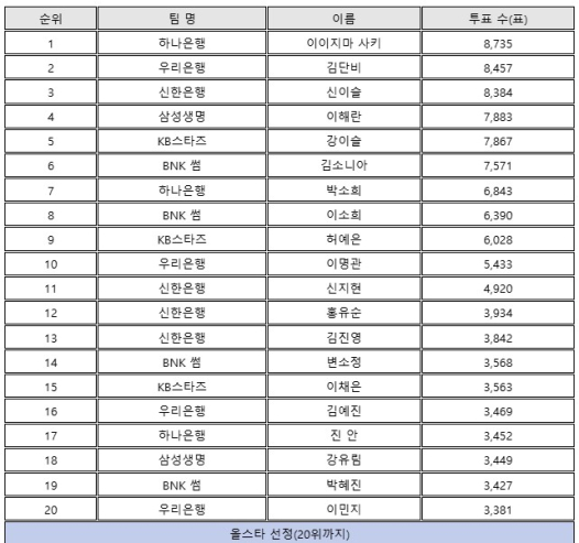 올스타 중간 투표 3위는 이슬(인천 신한은행), 4위는 이해란(용인 삼성생명)이 자리하고 있으며, 올스타 선발 마지노선인 20위는 우리은행 이민지가 기록 중이다. 20위부터 25위까지 표 차가 53표에 불과해 남은 투표 기간 순위 변동 가능성도 충분하다.
