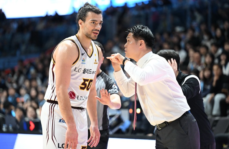 LG 마레이와 조상현 감독이 14일 고양소노아레나에서 열린 소노와의 2025~26 LG전자 프로농구 정규리그 경기 중 대화를 나누고 있다. 사진=KBL 3쿼터 초반 분위기는 어수선했다. 수비 상황서 진영이 무너지며 빠른 득점이 양쪽 코트에서 나왔다. LG에선 양홍석, 소노에선 켐바오가 힘을 냈다.