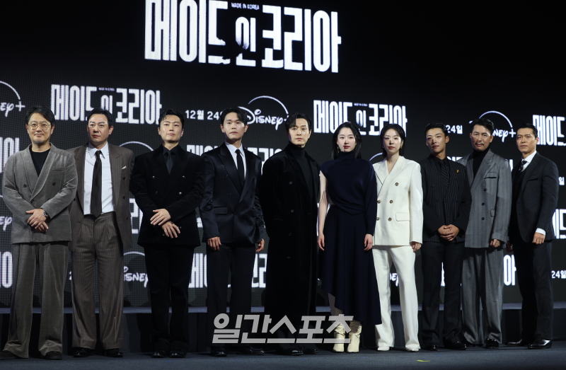우민호 감독, 배우 박용우, 노재원, 강길우, 정성일, 원지안, 서은수, 우도환, 정우성, 현빈이 15일 오전 서울 강남구 그랜드 인터컨티넨탈 서울 파르나스에서 열린 디즈니+ 오리지널 '메이드 인 코리아' 제작발표회에 참석해 포토타임을 갖고 있다.