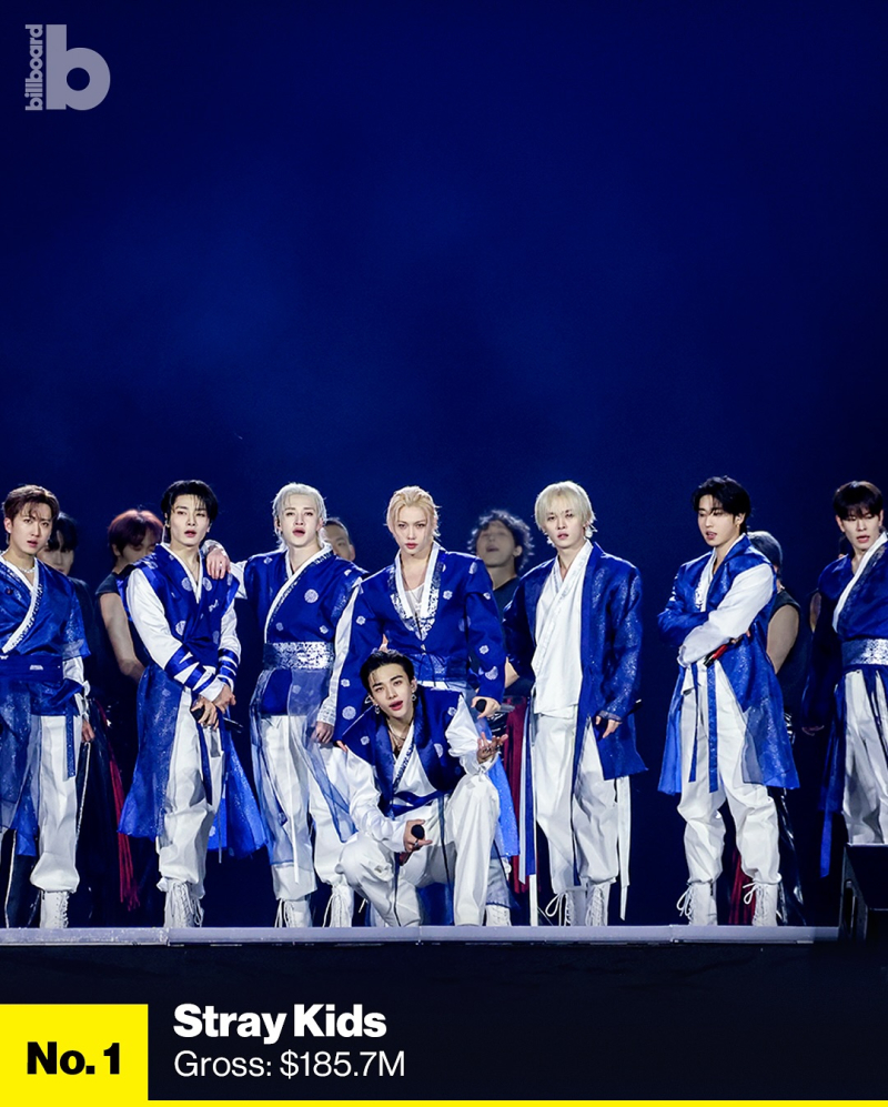 해당 차트에 따르면 1위에는 스트레이 키즈가 이름을 올렸다. 스트레이 키즈는 올 한 해 투어를 통해 1억 8570만달러(약 2739억원)의 티켓 수익을 냈다. 이는 K팝은 물론, 톱 투어(Top Tours) 10위에 해당하는 수치다.