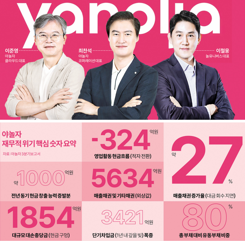 기업공개(IPO)를 준비해온 야놀자가 ‘재무적 딜레마’에 빠졌다. 매출과 순이익은 증가했지만 실제 기업 내 현금이 마르고 단기 부채가 급증하는 유동성 경색(돈맥경화) 경고음이 들린다. 최근 회사의 성장을 주도했던 배보찬·김종윤 대표 등 창업 공신들을 경영 일선에서 물러나게 하고 재무 및 기술 전문가로 최고경영진을 전면 교체한 것은 이러한 재무 위기감을 잠재우기 위한 조치하는 해석이다.