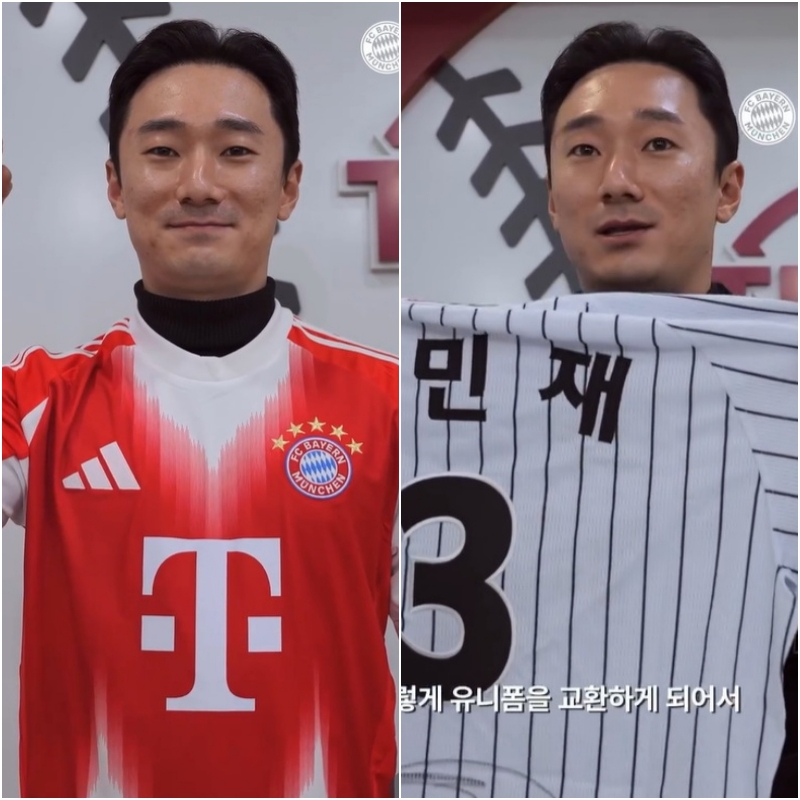 신민재는 독일 분데스리가 축구 명문 FC 바이에른 뮌헨 구단의 소셜미디어(SNS)에 등장했다. 뮌헨 구단이 지난 15일 '민재가 민재에게'라는 제목의 영상을 게재한 것이다. '두 민재'는 축구대표팀 김민재와 한국 야구대표팀 신민재를 의미한다. 신민재. 사진=뮌헨 SNS 최근 뮌헨 관계자가 서울 잠실구장을 찾아 신민재에게 선물을 전달했다. 상자 안에는 김민재의 등번호인 3과 영문명 'MINJAE'가 적힌 뮌헨 유니폼이 있었다. 이에 신민재는 LG 유니폼에 '김민재'와 '3'을 새겨넣어 답례했다. 신민재는 "같은 민재로서 앞으로도 선전을 기원하겠습니다. 민재 파이팅!"이라고 외쳤다. 유니폼 교환 이벤트는 뮌헨 구단이 먼저 제안했다. 해당 영상은 신민재가 KBO 골든글러브 수상(2루수 부문)한 이틀 뒤인 지난 11일 촬영됐다.