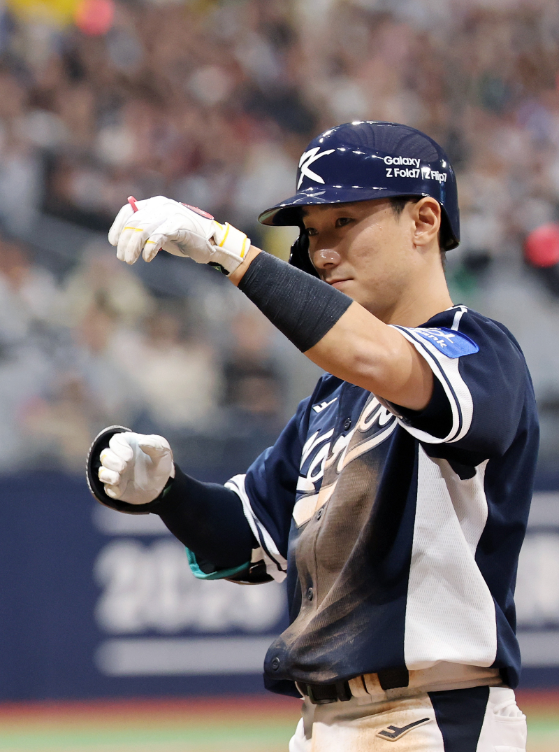 신민재가 26일 서울 잠실야구장에서 열린 한화와의 한국시리즈 1차전 6회 말 1사 만루 때 2타점 적시타를 친 후 기뻐하고 있다. <저작권자 ⓒ 1980-2025 ㈜연합뉴스. 무단 전재 재배포 금지, AI 학습 및 활용 금지> LG 트윈스 내야수 신민재(29)가 누구보다 행복한 12월을 보내고 있다.