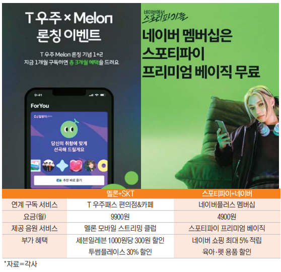 세계 최대 음원 스트리밍 플랫폼 스포티파이가 네이버플러스 멤버십의 콘텐츠 혜택에 포함되자, 카카오엔터테인먼트 멜론은 국내 1위 이동통신사 SK텔레콤의 구독 서비스 ‘T 우주’ 제휴 상품으로 맞불을 놨다.