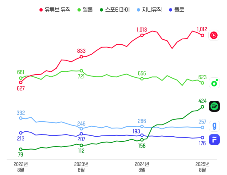 앱 분석 서비스 와이즈앱·리테일의 올해 8월 조사에서 멜론은 MAU(월간 활성 이용자 수) 623만명으로 유튜브 뮤직(1012만명)에 이어 2위를 기록했다. 멜론에 큰 변화가 없었던 1년 사이 스포티파이는 MAU가 158만명에서 424만명으로 뛰며 지니뮤직, 플로를 제치고 3위로 우뚝 섰다. 다양한 제휴 이벤트와 신규 기능을 선보인 덕이다.
