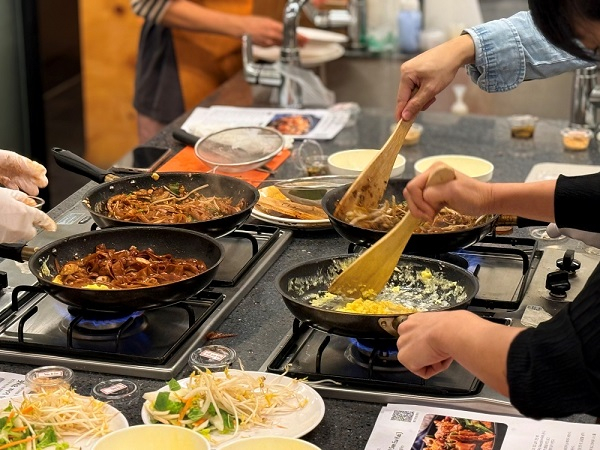 쏨땀 카오폿은 절구를 활용해 재료를 빻아 만드는 태국식 샐러드로, 옥수수를 활용한 상큼한 맛이 특징이다. 팟씨유 까이는 다크소이 소스를 사용해 볶아낸 쌀국수 요리로, 새콤달콤한 팟타이와 달리 간장의 깊고 짭짤한 풍미를 살린 메뉴다. 재료 준비부터 소스 소분까지 모두 사전에 준비돼 참가자들은 별도의 준비물 없이 수업에 참여할 수 있었다.