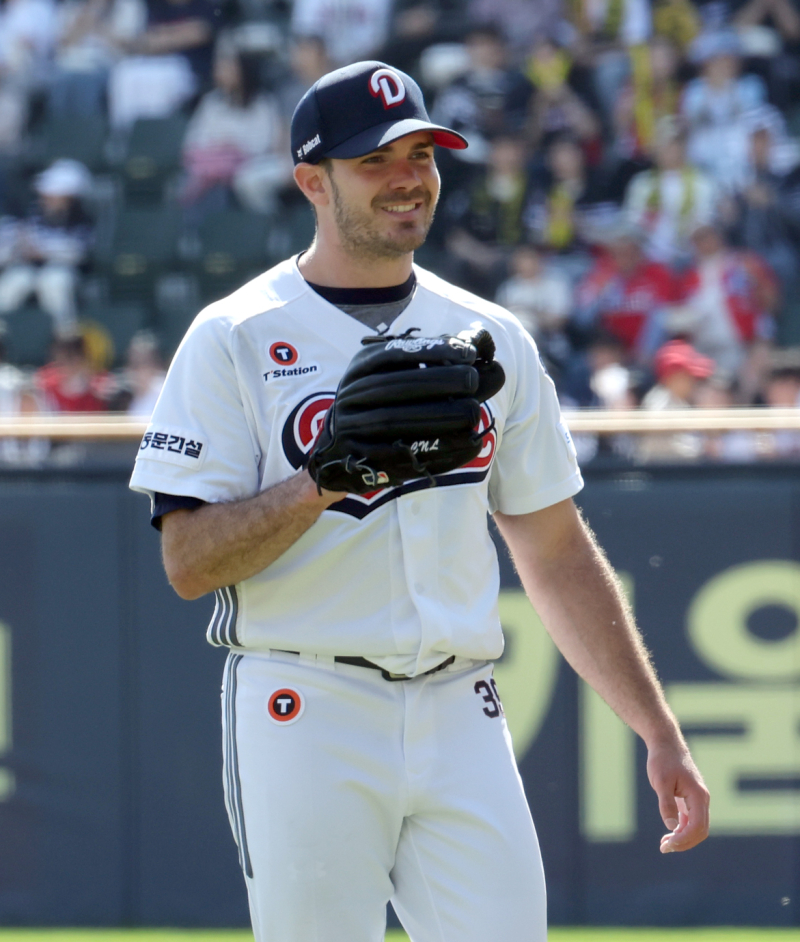 플렉센은 "두산 베어스에 다시 합류해 팬들 앞에서 투구하게 돼 정말 설렌다. 팀이 가을야구 진출을 넘어 우승까지 노리는 데 보탬이 되겠다"고 밝혔다. 20일 오후 잠실야구장에서 열린 2025 프로야구 KIA와 두산 경기. 두산 선발 잭로그가 5회 KIA 최원준을 유격수 플라이로 아웃시키고 미소 짓고 있다. 잠실=정시종 기자 capa@edaily.co.kr /2025.04.20. 두산은 잭로그와 총액 110만 달러(16억2000만원)에 재계약하며 외국인 투수 구성을 마쳤다.