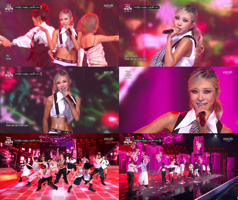 이어지는 ‘바디’ 무대에서는 화이트 크롭 셔츠에 체크 넥타이와 멜빵, 오버핏 팬츠를 매치해 힙한 매력을 발산하며 분위기를 반전시켰다.