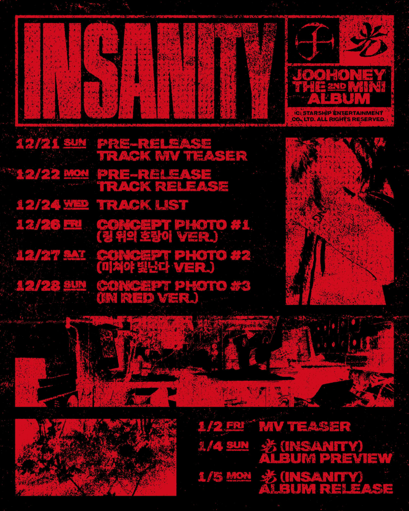 소속사 스타쉽엔터테인먼트는 지난 19일 몬스타엑스 공식 SNS 채널을 통해 주헌의 미니 2집 ‘광 (INSANITY)’ 앨범 스케줄러를 공개했다. 레드와 블랙 톤의 빈티지 포스터 형태로 제작된 해당 스케줄러는 다양한 티징 콘텐츠 일정으로 기대감을 더한 것은 물론, 복싱 경기장을 연상케 하는 감각적인 디자인으로 눈길을 끌었다.
