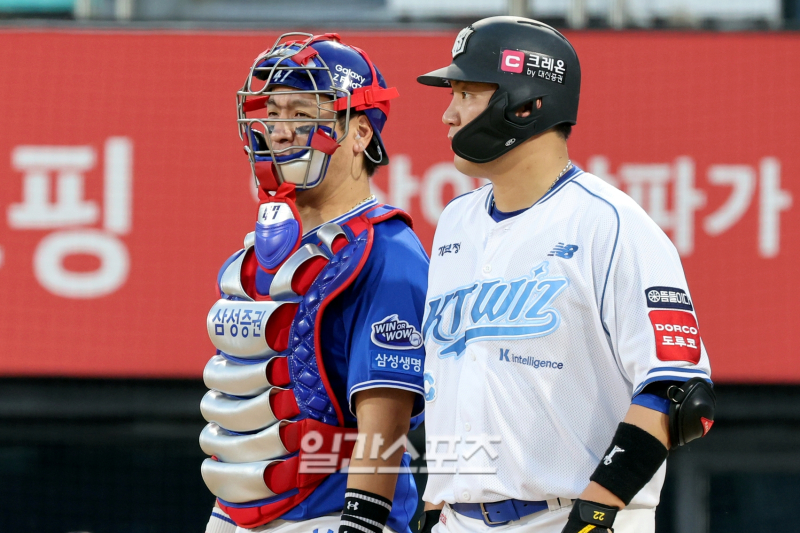 27일 오후 수원 KT위즈파크에서 열린 2025 프로야구 삼성과 KT 경기. KT 장성우가 6회 타석에 들어서고 있다. 삼성 포수 강민호 강민호 장성우 수원=정시종 기자 capa@edaily.co.kr /2025.07.27.