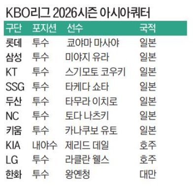 KIA는 아시아쿼터로 투수 영입을 심도 있게 검토했다. 지난달 초 일본 오키나와 마무리캠프에서 일본 프로야구(NPB) 요미우리 자이언츠 출신 왼손 투수 이마무라 노부타카 등을 테스트하기도 했다. 당시만 해도 아시아쿼터 활용 방향이 '일본인 투수'로 정해지는 듯했다. 하지만 자유계약선수(FA) 권리를 행사한 박찬호가 지난달 18일 두산으로 이적하면서 내부 상황이 복잡해졌다.