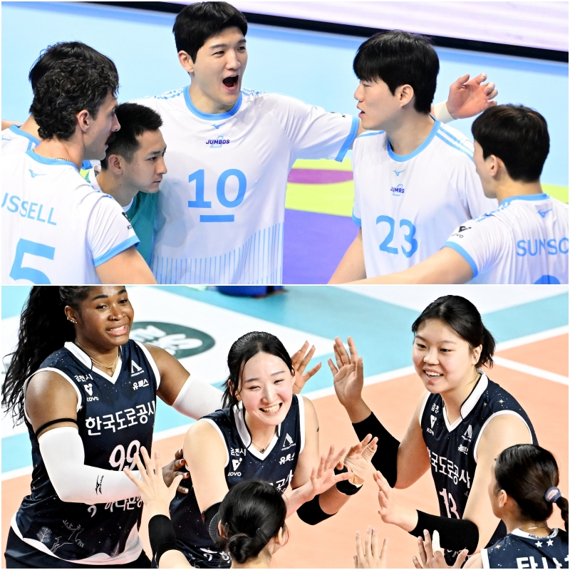 2025~26시즌 선두를 달리는 대한항공(위)과 한국도로공사 선수단. 사진=KOVO 2025~26 진에어 V리그가 30일 반환점을 통과하면서 봄 배구를 향한 순위 경쟁은 더욱 뜨거워질 전망이다. 남자부는 대한항공이 개막 후 줄곧 선두를 달리는 가운데 '디펜딩 챔피언' 현대캐피탈(2위)과 KB손해보험(3위)이 뒤를 바짝 쫓고 있다. '배구 명가' 삼성화재(3승 15패·7위)의 몰락 속에 4~6위 한국전력-OK저축은행-우리카드가 호시탐탐 포스트시즌(PS) 진출을 노린다.