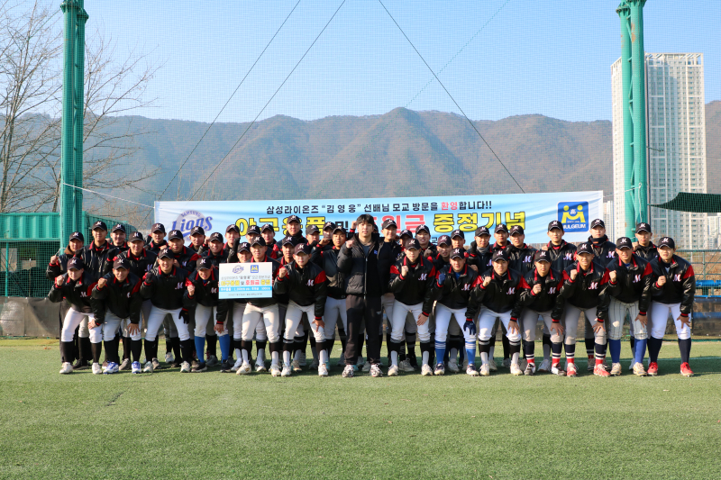 김영웅은 지난 27일, 모교인 양산 물금고등학교를 방문해 후원금 500만원과 2200만원 상당의 야구용품을 전달했다.