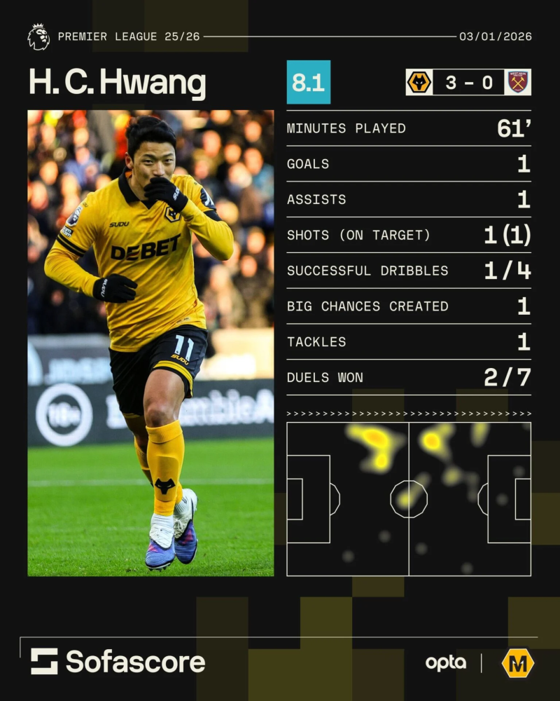 울버햄프턴 소식을 다루는 ‘몰리뉴 뉴스’는 4일(한국시간) “황희찬이 이번 시즌 최고의 퍼포먼스를 보여줬다”고 조명했다. 이날 울버햄프턴은 영국 울버햄프턴의 몰리뉴 스타디움에서 열린 2025~26 EPL 20라운드 홈경기서 웨스트햄을 3-0으로 제압했다.