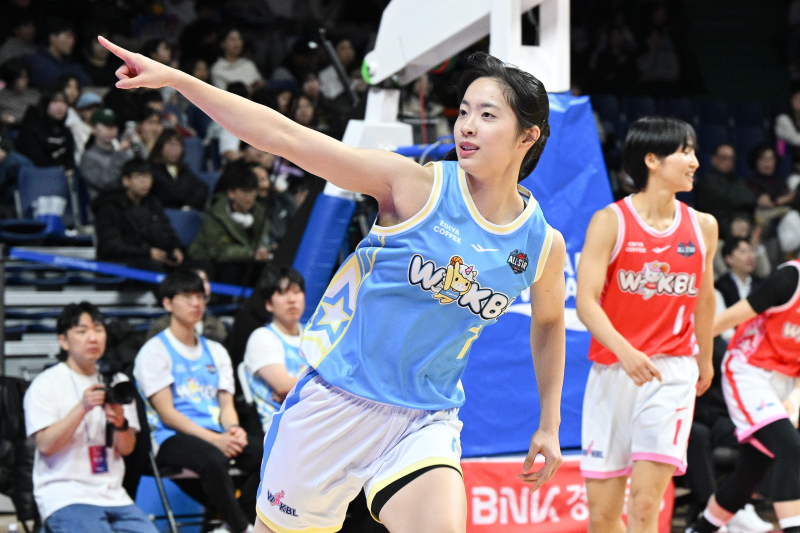 4일 부산 사직실내체육관에서 열린 BNK금융 2025~26 여자프로농구(WKBL) 올스타전에서 심판 복장으로 웃음을 자아낸 김단비. WKBL 제공4일 부산 사직실내체육관에서 열린 BNK금융 2025~26 여자프로농구(WKBL) 올스타전에서 득점에 성공한 뒤 세리머니하는 박소희. WKBL 제공