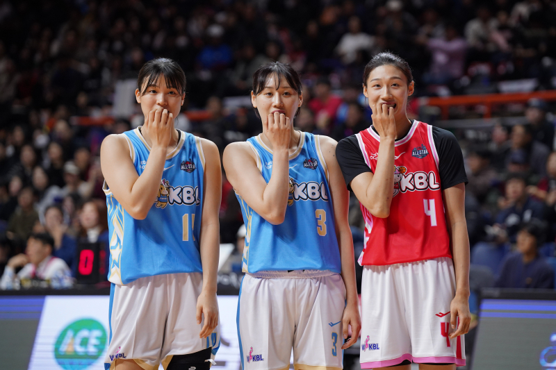 4일 부산 사직실내체육관에서 열린 BNK금융 2025~26 WKBL 올스타전에서 강이슬, 이혜란과 함께 퍼포먼스를 펼치는 변소정(왼쪽). WKBL 제공