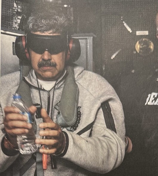 트럼프 미국 대통령이 3일(현지시간) 미군이 기습적인 군사 작전으로 체포한 니콜라스 마두로 베네수엘라 대통령의 근황 사진을 사회관계망서비스(SNS) 트루스소셜에 공개했다.