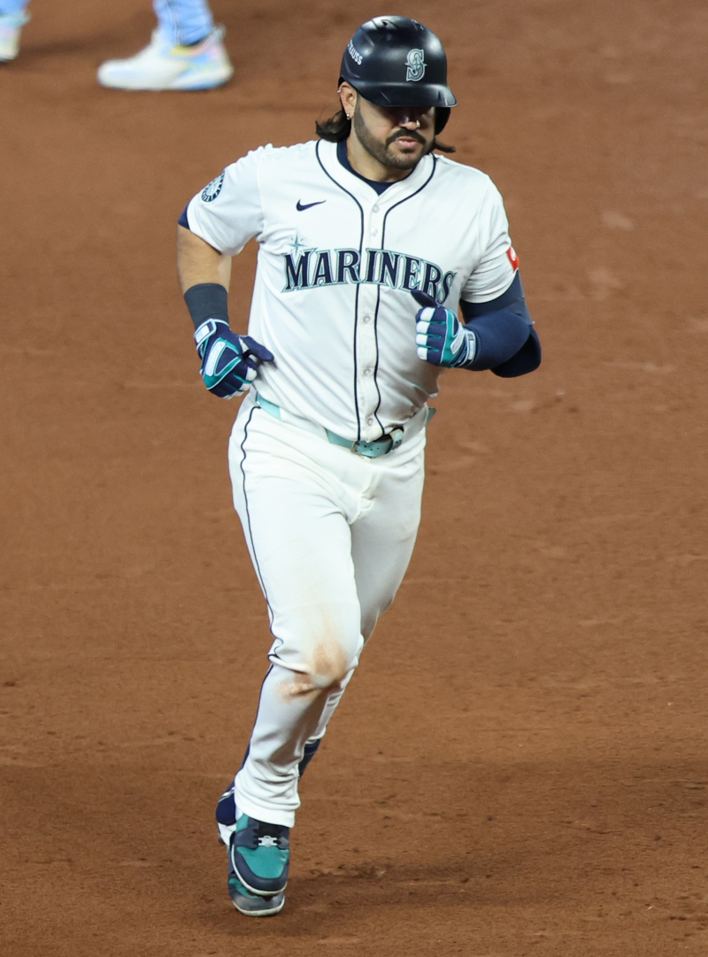 Seattle Mariners Eugenio Suarez (28) runs the bases after hitting a grand slam home run in the eighth inning against the Toronto Blue Jays during game five of the MLB American League Championship Series at T-Mobile Park in Seattle, Washington, on Friday, October 17, 2025. Photo by Aaron Josefczyk/UPI/2025-10-18 10:19:03/ <저작권자 ⓒ 1980~2025 ㈜연합뉴스. 무단 전재 재배포 금지, AI 학습 및 활용 금지>