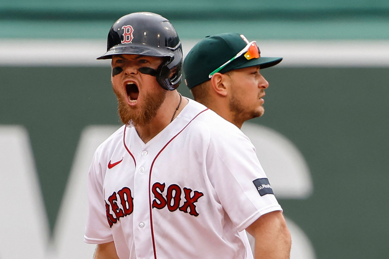 Oakland Athletics' Cody Thomas (48) slides into second base with a double as Boston Red Sox's Christian Arroyo can't handle the throw during the seventh inning of a baseball game, Saturday, July 8, 2023, in Boston. (AP Photo/Michael Dwyer)/2023-07-09 08:50:30/ <저작권자 ⓒ 1980~2023 ㈜연합뉴스. 무단 전재 재배포 금지.>