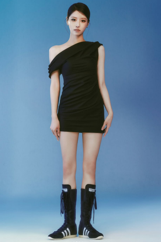 가장 먼저 눈길을 끄는 것은 이미주의 완벽한 피지컬이다. 군더더기 없는 슬림한 보디라인을 강조하는 블랙 원숄더 미니 드레스를 착용한 그는 매끈한 직각 어깨 라인을 과감하게 드러내며 고급스러운 섹시미를 완성했다.