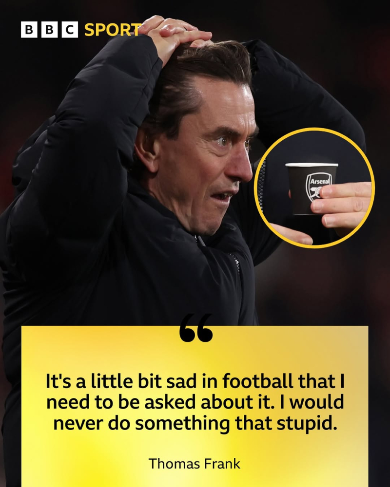 토마스 프랭크 토트넘 감독이 ‘아스널 종이컵’을 들고 등장해 팬들의 이목을 끌었다. 현지 매체의 지적을 들은 프랭크 감독은 “전혀 몰랐다”고 반응했다.