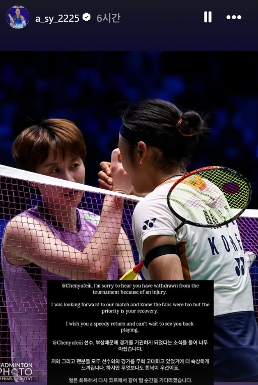 사진=안세영 SNS 배드민턴 여자 단식 세계랭킹 1위 안세영(삼성생명)의 '천적' 천위페이(중국·4위)의 기권으로 새해 첫 대회 결승에 진출했다.