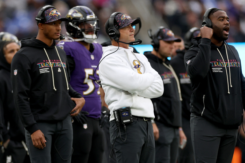 BALTIMORE, MARYLAND - OCTOBER 12: Head coach John Harbaugh of the Baltimore Ravens looks on during the fourth quarter against the Los Angeles Rams in the game at M&T Bank Stadium on October 12, 2025 in Baltimore, Maryland. Patrick Smith/Getty Images/AFP (Photo by Patrick Smith / GETTY IMAGES NORTH AMERICA / Getty Images via AFP)/2025-10-13 05:08:47/ <저작권자 ⓒ 1980~2025 ㈜연합뉴스. 무단 전재 재배포 금지, AI 학습 및 활용 금지>