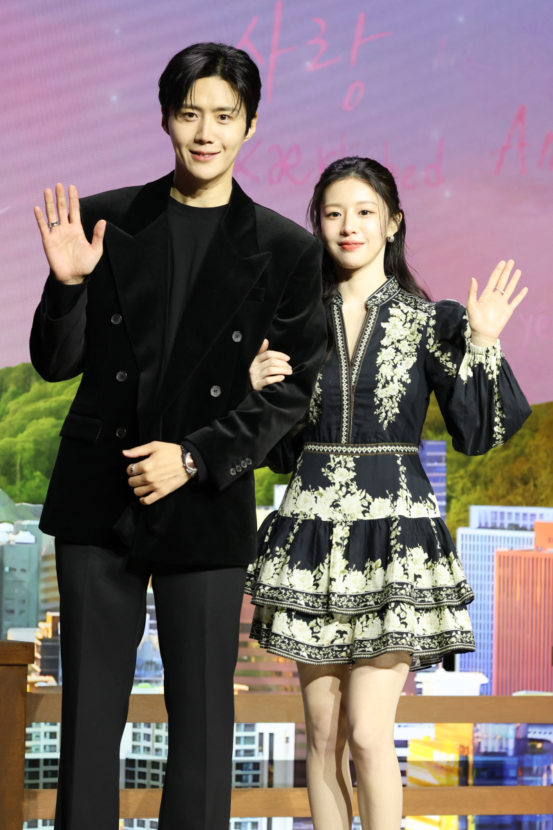 배우 김선호와 고윤정이 13일 서울 강남구 조선팰리스 서울 강남 호텔에서 열린 넷플릭스 시리즈 '이 사랑 통역 되나요?' 제작발표회에서 포즈를 취하고 있다. 2026.1.13 / 사진=연합뉴스 제공