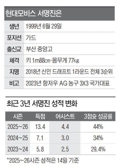 서명진은 13일 열린 2025~26 LG전자 프로농구 정규리그 서울 삼성과의 홈 경기에서 존재감을 뽐냈다. 이날 그는 팀 내 최다인 22점을 책임지며 팀의 탈꼴찌를 견인했다. 마지막 공격이 압권이었다. 현대모비스는 4쿼터 종료 18초 전 외국인 선수 케렘 칸터에게 앤드원 플레이를 내주며 72-74로 역전을 허용했다. 작전 타임을 신청한 양동근 감독은 서명진에게 외곽슛 기회를 맡기는 전략을 펼쳤다. 결과는 대성공. 경기 종료 0.9초를 남기고 터진 3점슛이 림을 가르며 승부가 뒤집혔다.