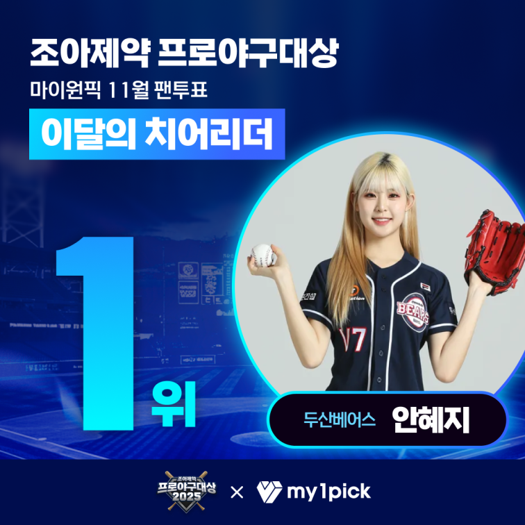 두산베어스의 안혜지 치어리더가 '조아제약 프로야구 대상' 11월 이달의 선수 팬 투표에서 48%의 득표율로 1위를 차지했다. 본 투표는 KBO 리그 소속 치어리더를 대상으로 최다 득표자를 선정하는 방식으로 진행됐다. 월간 누적 점수는 연말 시상식인 '조아제약 프로야구대상의' 인기 치어리더상 부문에 반영됐다.