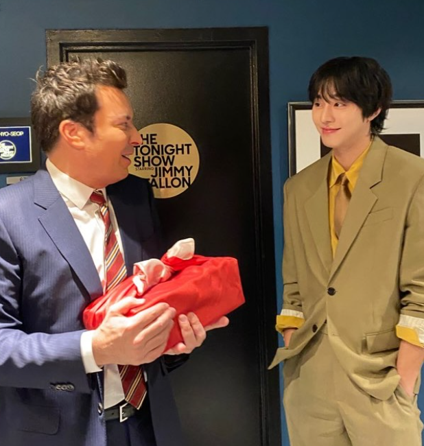 사진에는 안효섭이 ‘지미 팰런 쇼’의 로고 앞에서 엄지 포츠를 취하고 있는 모습, 지미 팰런과 마주 보며 미소를 짓고 있는 사진 등이 담겼다. 특히 안효섭은 노란색 셔츠와 카키톤 계열 정장으로 온화한 분위기를 자아내 눈길을 끈다.