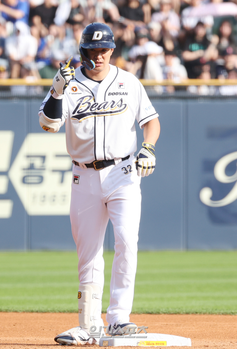 2024 KBO리그 프로야구 두산 베어스와 삼성 라이온즈의 경기가 14일 오후 서울 잠실야구장에서 열렸다. 2회말 1사 김재환이 2루타를 치고 출루하고 있다. 잠실=김민규 기자 /2024.07.14/
