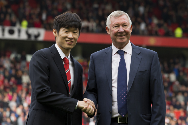 (AP=연합뉴스) 박지성(왼쪽)과 알렉스 퍼거슨 전 맨유 감독과 악수를 하고 있다.