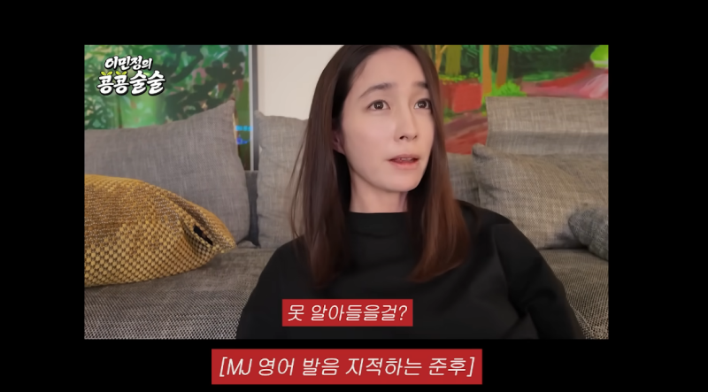 이에 이민정은 “결국은 영어를 배우려면 술을 마시란 건가”라며 “요새 준후(아들)가 나한테 자꾸 조금씩 지적질을 한다”며 고충을 토로해 웃음을 안겼다. 사진=유튜브 채널 ‘이민정 MJ’ 11세 아들의 깜찍한 지적에 이민정은 “내 돈 들여 가르쳐 놨더니 나한테 막 ‘엄마 이건 좀 못알아들을 것 같은데’ 이런 얘기를 하니까 ‘빠직’한다”고 털어놨다.