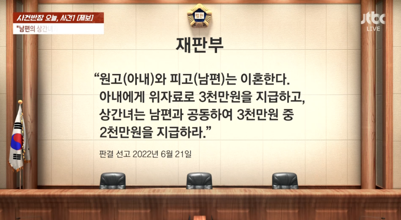 법원은 “혼인 파탄의 책임이 남편과 상대 여성에 있다”고 판단해 위자료 3천만 원을 남편과 상간녀가 연대해 지급하라고 판결했다. 그러나 제보자는 “현재까지 위자료를 받지 못했고, 남편과의 재산분할도 아직 정리되지 않았다”고 밝혔다.