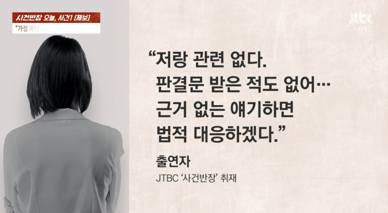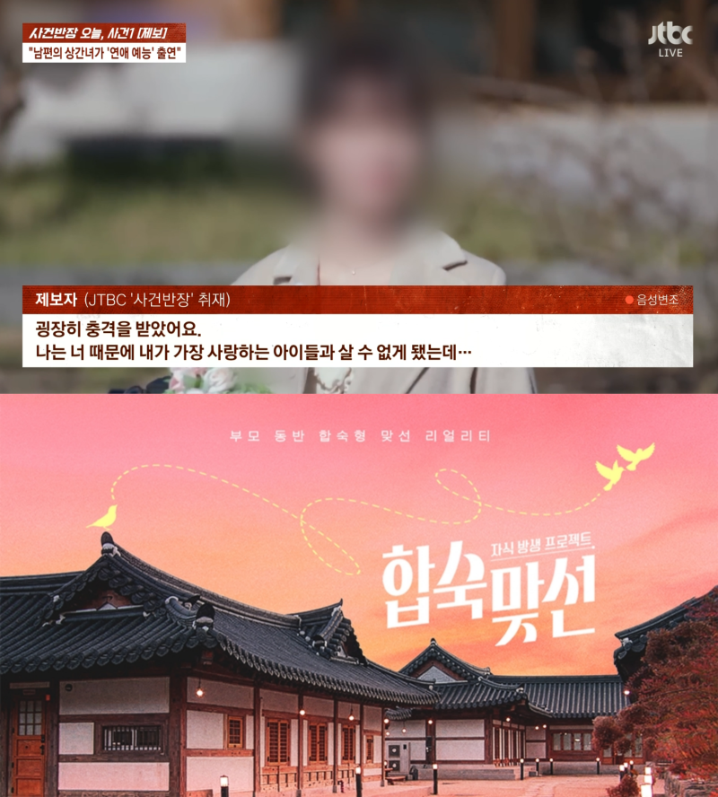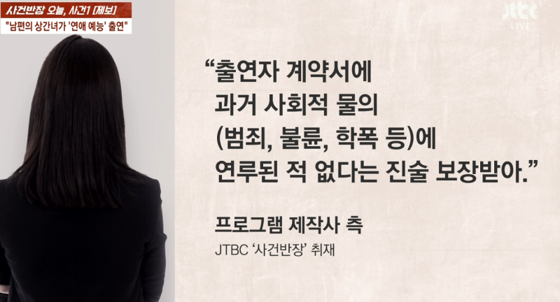 앞서 이날 오후 방송한 JTBC ‘사건반장’에선 4년 전 남편의 불륜으로 이혼했다는 40대 제보자가 “남편의 불륜 상대가 한 연애 예능 프로그램에 출연하는 걸 보고 큰 충격을 받았다”며 사연을 제보했다.