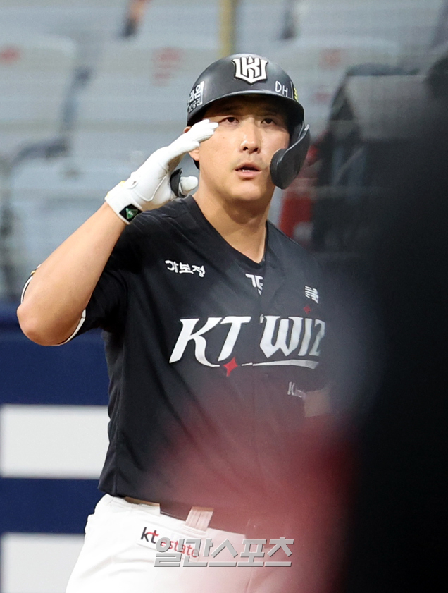 25일 오후 서울 고척스카이돔에서 열린 2025 프로야구 KT 와 키움 경기. KT 황재균이 3회 1사 1,2루서 1타점 적시타를 날리고 기뻐하고 있다. 고척=정시종 기자 capa@edaily.co.kr /2025.05.25.