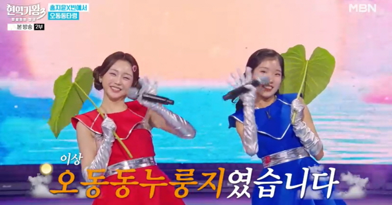 흑기사로 나온 민우혁은 감미로우면서도 파워풀한 보이스를 분출하며 5인과 ‘젊은 태양’을 흥미진진한 서사의 농밀한 무대로 완성해 열기를 절정으로 이끌었다. 마지막으로 ‘천기가왕’ 팀은 개성 넘치는 매력을 하나로 뭉쳐 터트린 ‘사미인곡’으로 폭풍보다 거센 전율을 선사하며, 모두를 기립하게 했다. 신동엽의 “끝나고 5만 원씩이라도 걷어 드려야 하나”라는 극찬과 더불어 연예인 판정단에게 212점이라는 높은 점수를 받았다. 사진=MBN 리더 홍지윤과 빈예서-소유미-구수경-강혜연이 모인 구수한 트롯 아이돌 ‘누룽지캬라멜’은 애니메이션 주인공 같은 복장으로 등장했다, 5인은 첫 곡 ‘소문 좀 내주세요’부터 흑기사인 박영규를 등판시켰고, 박영규는 걸그룹을 키우는 대표를 연기하며 미달이 아빠 대사까지 선보여 현장을 뜨겁게 달궜다. 홍지윤과 빈예서는 정통 트롯 강자들의 180도 다른 매력을 마음껏 발산하며 ‘오동동타령’을 귀엽고 깜찍한 매력으로 구현했고, 강혜연과 구수경은 분위기를 확 바꾸며 ‘서울 여자’로 아련하고 애절한 감성을 터트렸다.