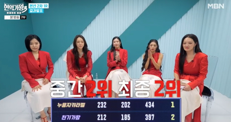 뒤이어 김태연은 ‘새타령’으로 화끈한 국악 트롯의 맛을 살렸고, 솔지는 음원 강자 흑기사 임한별과 ‘귀로’로 가슴 절절한 감정선이 녹아 있는 고품격 듀엣을 이뤄냈다. ‘오! 미소자매’ 전원이 출동해 ‘사랑아’로 흥겨운 댄스파티를 펼쳐내더니 분위기를 완전히 반전시킨 가슴 먹먹한 ‘살다보면’으로 원곡자 차지연부터 린, 이지혜, 별사랑까지 모두의 눈물샘을 자극했다. 연예인 판정단 중 무려 4명이 20점 만점을 눌렀지만, 점수 총합은 207점에 그쳐 아쉬움을 삼켰다. 사진=MBN사진=MBN 본선 2차전 1라운드 팀 미션이 끝난 후 연예인 판정단 점수 공개 결과 1위 ‘누룽지캬라멜’과 4위 ‘오방신녀’ 간 49점 점수 차로 긴장감을 치솟게 했다. 여기에 공개되지 않았던 260점이 걸린 국민 판정단 점수가 더해졌고, 총합 434점을 획득한 ‘누룽지캬라멜’이 연예인 판정단 순위와 변동 없이 1위에 등극했다. 2위는 397점을 받은 ‘천기가왕’, 3위는 369점의 ‘오! 미소자매’, 4위는 334점의 ‘오방신녀’가 차지했다. 각 팀의 에이스들이 출전해 ‘순위 뒤집기’에 나서는, 본선 2차전 2라운드 ‘에이스전’이 남은 가운데 최종 1위의 기쁨을 안고 본선 3차전에 직행할 단 한 팀은 어디일지 초미의 관심이 쏠린다.