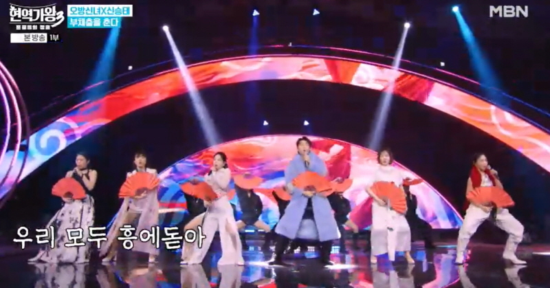 그 순간 우수에 찬 눈빛의 흑기사로 등장한 신승태는 ‘와’ 노래와 함께 신들린 댄스를 시작해 현장을 뒤집었다. 이어 신승태는 ‘오방신녀’ 5인과 어우러져 ‘부채춤을 춘다’로 빨간 부채 퍼포먼스를 중독성 있게 완성했다. 특히 마스터 김수찬과 박구윤은 폭발적인 무대를 만든 신승태를 향해 “우리 거 할 때나 열심히 하지”라는 원성을 보내 박장대소케 했다. 하지만 ‘오방신녀’ 팀은 하나 되지 못한 팀워크를 지적받으며 240점 만점의 연예인 판정단 점수에서 183점을 획득했다. 사진=MBN 다음으로 리더 스테파니와 차지연-홍자-장하온-장태희가 뭉친 ‘천기가왕’ 팀은 새빨간 의상을 입고 무대 위에 올라 트롯 어벤져스의 위용을 뽐냈다. 준비 과정에서 몸을 쓰는 데 익숙하지 않은 홍자와 연습에서 실수를 계속한 장태희가 불안감을 자아냈지만 ‘천기가왕’ 5인은 첫 곡 ‘미니스커트’부터 한 편의 뮤지컬 같은 환상적인 퍼포먼스로 “이게 언니들의 섹시다”라는 탄성이 터지게 했다.