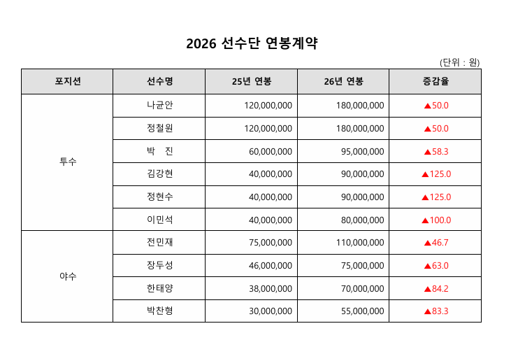 선발진에서 가장 꾸준한 투구 내용을 보여준 나균안은 1억2000만원에서 6000만원 오른 1억8000만원에 계약했다. 셋업맨 정철원도 역시 같은 인상액으로 1억8000만원 계약서를 받아들였다. 잠재력을 드러낸 1라운더 선발 투수 이민석도 100% 오른 8000만원에 사인했다. 지난 2년 동안 스윙맨 역할을 해낸 박진도 6000만원에서 3500만원 오른 9500만원을 받게 됐다.