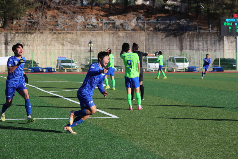 후반 들어 분위기가 급변했다. 중앙대가 4분 만에 3골을 몰아쳤다. 후반 15분 중앙대 김수민이 이태경의 크로스를 머리로 받아 넣으며 추격이 시작됐다. 2분 뒤에는 최강민이 페널티 박스 안 왼쪽에서 오른발로 감아 찬 슈팅이 절묘한 궤적을 그리며 골망을 갈랐다. 후반 19분에는 김수민이 오른쪽에서 낮게 온 크로스를 오른발로 마무리하며 중앙대가 3-2로 역전했다.