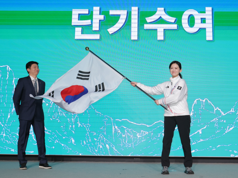 유승민 대한체육회장은 이수경 단장에게 선수단기를 수여했고, 최휘영 장관은 선수 대표로 나온 쇼트트랙 최민정과 스피드 스케이팅 정재원에게 격려 메시지 보드와 기념품을 전했다.